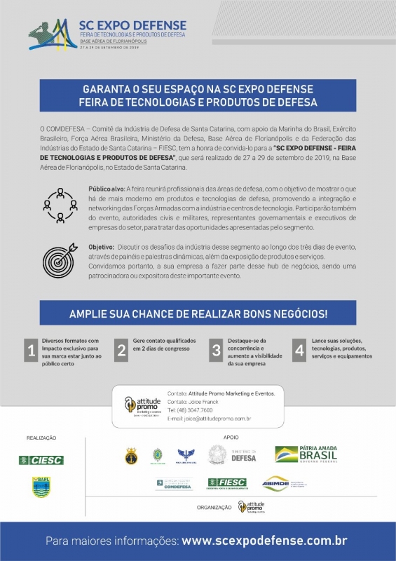 De 27 a 29 de setembro acontece, em Florianópolis, a SC EXPO DEFENSE – FEIRA DE TECNOLOGIAS E PRODUTOS DE DEFESA. O evento mostrará o que há de mais moderno em produtos e tecnologia de Defesa, promovendo a integração das Forças Armadas com a indústria e os centros de tecnologia. O evento conta com apoio da ABIMDE, participe - www.scexpodefense.com.br