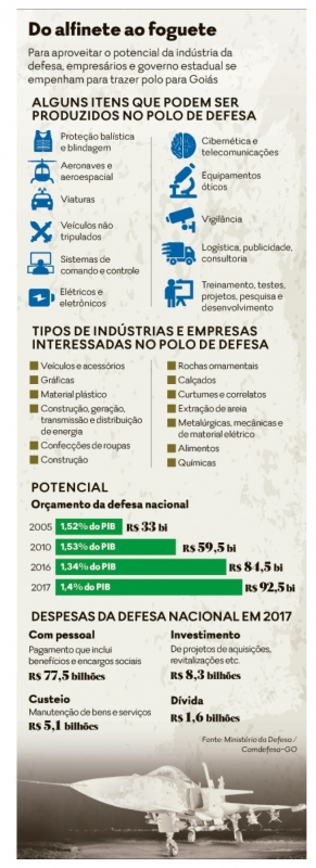 Localização geográfica estratégica e a presença de centros importantes para as Forças Armadas fazem Goiás ter potencial para produzir e comercializar produtos e serviços voltados para defesa e segurança. Para aproveitar o mercado, que movimenta cerca de R$ 3,7 bilhões por ano no País, empresários e governo estadual aumentaram, nos últimos meses, as ações para criar um polo industrial com esse foco e que pode impulsionar a indústria 4.0 com o desenvolvimento de novas tecnologias no Estado.