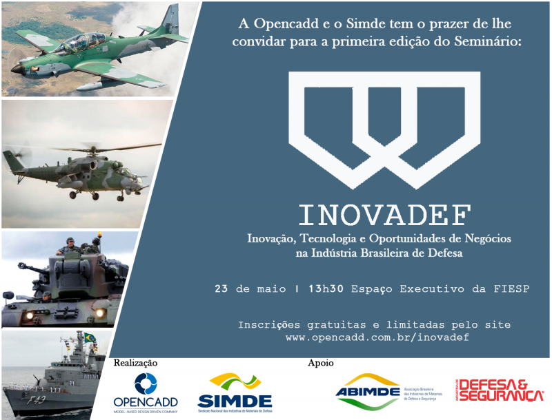 A Opencadd, empresa de tecnologia especializada em Model-Based Design, e o Simde (Sindicato das Indústrias de Materiais de Defesa), realizam no próximo dia 23/05, no Espaço Executivo da Fiesp (Federação das Indústrias do Estado de São Paulo), a primeira edição do seminário Inovadef. Voltada a profissionais ligados a indústrias brasileiras do setor, a iniciativa tem por objetivo discutir e lançar alternativas de estímulo ao desenvolvimento de projetos voltados à Inovação e Tecnologia, bem como debater as Oportunidades de Mercado presentes atualmente na Indústria Brasileira de Defesa. O evento tem o apoio da Abimde (Associação Brasileira das Indústrias de Materiais de Defesa e Segurança).